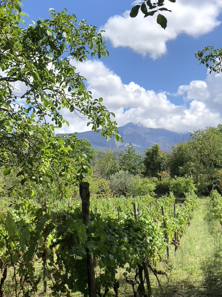 現在、ソニアは12カ所の区画で計2haのブドウを栽培している。ブドウ畑は標高1,100-1,300 mとエトナで最も高く、周りはピスタチオの畑ばかり。そのため、エトナを代表するネレッロ・マスカレーゼなどの品種はうまく育たない。その代わりに、黒ブドウはグルナッシュやアリカンテ・ブーシェ、白ブドウはグレカニコ・ドラートが中心で、他にも15種類ほど、中には品種が不明なブドウも植えられている。そして、火山性の砂質土壌のためフィロキセラが広まらず、樹齢120年を超えるブドウが多く見られる。すべてが自根である。山の西側はエトナDOCに含まれないが、近年その冷涼な気候と手つかずの高樹齢を求めて、多くの生産者が西側の畑を購入し始めている。ソニアは古来のアルベレッロ仕立てのブドウを守り、完全手作業かつ化学薬品を一切使わずに畑を管理している。