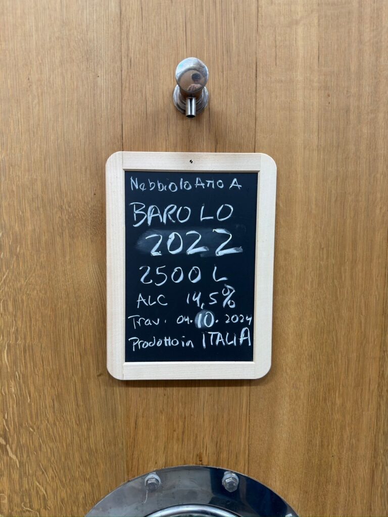 「現在、バローロおいて最大のリスクは温暖化によるブドウの過熟。個人的にアルコール度数が上がりすぎることよりも、ブドウの糖度の成長速度に種やタンニンの成熟が伴わないことによるアンバランスさを一番懸念している。」そう語るアランは基本的にグリーンハーベストをせず、ブドウの蔓もカットせずに巻き付ける”アル・カプレ”という手法を取っている。ブドウを西日や雹から守りながら、種やタンニンの十分な成熟を待てるという。また、樽選びも徹底的にこだわり、彼のバローロにとって理想的としてミッテルベルガー社の大樽を使用している。また、ボトリングでも最初と最後で差が出ないように一日で全てのボトリングを行う。