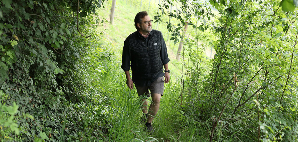 現在、彼はセッラルンガ(ヴィーニャ・リオンダMGAに隣接する、彼が”ソット・リオンダ”と呼ぶ区画)、モンフォルテ(ジネストラ地区)、ヴィニャーネMGA(バローロ村)、コステ・ディ・ローズMGA(バローロ村)に畑を所有し、ブドウ栽培は伝統的かつ従来の方法に基づいて行っている。剪定にはグイヨ方式を採用し、果実をつける枝は畑の場所に応じて8-11芽で剪定している。すべての畑では、剪定、枝の固定、トリミング、スカッチアトゥーラ(芽かき)、間引き、枝の配置、棚仕立ての掃除、アーチ状の枝を編む”Ar Caplé”、そして収穫まで、すべて手作業で行っている。4-5年ごとに堆肥化した牛糞を冬の終わりから春の初めにかけて肥料として使用し、1本のブドウ樹には6-9房のブドウを厳選して残す。Ar Caplé”方式では、長く伸びた枝を編み込み、果実を日焼けから守るための日陰を作り、さらに雹からも保護する。「糖分の成熟がタンニンの成熟を先行しないように、ヴェレゾン期前のグリーンハーベストによる摘み取りはほとんど行わない」とアランは説明する。収量は41-47 hL/haであり、標高が高いモンフォルテの畑ではやや少なくなる。「銅と硫黄はごく少量のみ使用し、植物と果実を適切に保護している。また、コンポスト化された海藻肥料を年に2-3回葉面に少量散布し、植生の健康と病気への抵抗力を高めている。この繊細な葉面散布は、果実の負荷を増やさず、植物が健全な成長を維持するために必要な栄養を提供してくれる」と彼は語る。