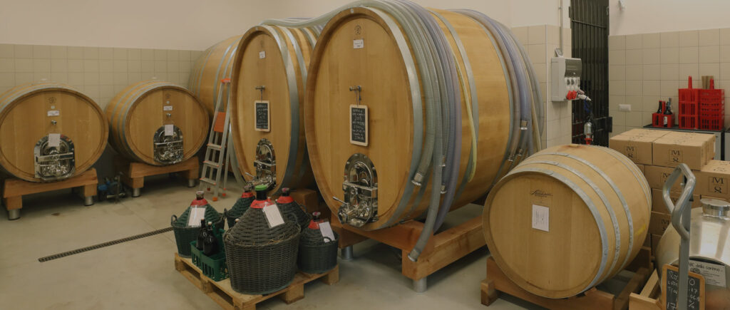 アルコール発酵には温度管理を行わない40-60 hLのコンクリートタンクを使用し、発酵は通常10-14日間、自然酵母によって行われる。活発な発酵期には1日2回ポンプオーバーを行い、一次発酵が完了すると、ワインは果皮とともに長期間マセレーションを行う。その後、伝統的な”カペッロ・ソンメルソ”方式を用いて、浮遊する果皮をワインに沈める。この工程により、ワインにさらなるストラクチャー、色、香りの複雑さが加わる。発酵終了後もさらに20-25日間のマセラシオンを続け、合計35-45日間のマセラシオン期間となる。「ただし、ヴィンテージごとに異なり、果皮の品質や特性によって最終的なマセラシオン期間は変わる。これはワインの状態に合わせて決めることで、私が一方的に決めるものではない」とアランは言う。