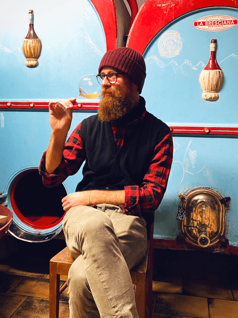 ワインの生産者訪問をしていると家やセラーに他のワイン生産者の空き瓶が飾ってあることがよくある。その生産者の好みや目指すスタイル、友人関係などを知るのに役に立ちとても興味深い。DRC、ルロワ、アルマンルソー、セロス、オヴェルノワなど、多くのワイナリーでトップ生産者のボトルを目にしたが、そこに並んでよく見かけたのが青いラベルに一本の木が描かれた水彩画のようなスタイリッシュなボトルだった。あまりにもよく目にするのであるブルゴーニュの生産者を訪問した際に聞いてみた。すると、「彼はニコラスと言って、ブドウの仕立てや剪定のプロで色々なところで生産者向けに講習を開いているんだ。そしてこれは彼がフリウリで自ら造っているワイン。素晴らしいワインだよ。」