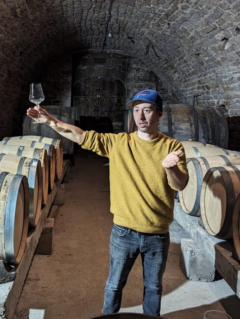 ポルトガルで初めてワインを造ったフィル。ワイン造りの難しさと大変さを実感したと同時に、奥深さと、初めてワインができた時の喜びと達成感はこれまでの人生で感じたどの喜びとも違う強烈で純粋な感動だった。土着品種以外に、ソーヴィニョン・ブランやリースリング、ピノ・ノワールなどの国際品種に興味を持った。より深くワインを学ぶため、その後はニュージーランドのホークスベイへと移り、ブドウ栽培とワイン醸造のディプロマを取得した。卒業後はマーティンボローのアタランギで働き、ピノ・ノワールへの情熱が確信に変わった。そして次なる舞台として彼が選んだのは、ブルゴーニュだった。ドメーヌ・デュジャック、パスカル・マルシャン、ダヴィッド・クロワ。地域を代表する生産者たちと働いた経験は、彼に“テロワールを活かす”という感覚を根づかせた。しかし同時に、彼の中である種のジレンマも生まれていた。「自分が好きな繊細で冷涼なワインを造るには、ブルゴーニュでも年々難しくなっている。気候変動で、かつてのような酸を表現するには無理をしなければならない。そんなときに出会ったのが、ジュラだった。」ダヴィッド・クロワから彼の友人であるドメーヌ・クールベで人を探していると紹介を受け、収穫に参加することにした。「ここだ。初めて南アフリカでブドウ畑を見てワイン造りに惹かれた時と同じ感覚がした」と当時を振り返る。